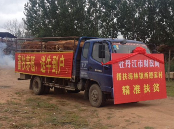 财政局向西德家村送去了10头牛和全局干部职工捐赠的慰问金、慰问品